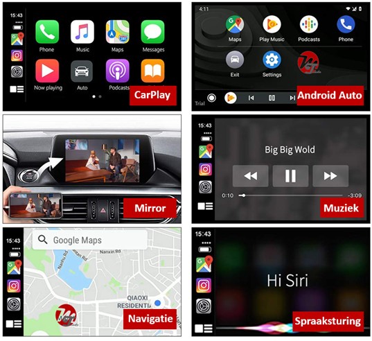 Integrate the latest mobile technology while retaining your original screen and all existing functions. This interface gives you access to Google and Waze navigation, Spotify, internet radio, Flitsmeister and other (music) apps such as CarPlay and Android Auto. With this interface you will never have outdated navigation again. You can also project the image from your phone onto the screen of the car (mirroring). All music is at your fingertips and you can keep your attention completely on the road!
